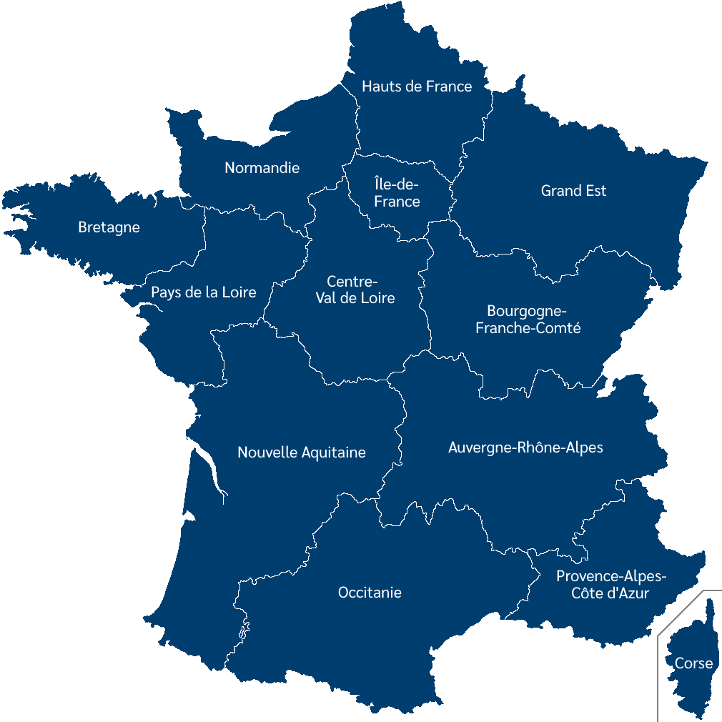 The mainland is known as Metropolitan France, and is divided into 13 regions, and 96 sub-regions called départements :