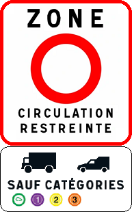Low emission zones are signposted thus, this example stating that traffic is prohibited, except (sauf) categories E, 1, 2 and 3: