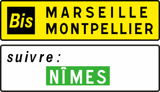 Originally signposted using green signage with a yellow square featuring the word Bis, their design was updated in 1998 (although many older signs still exist) to make them more easily recognisable - a yellow-on-black icon situated on a yellow panel: